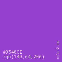 Цвет #9540CE в цветовой модели RGB обозначается тремя октетами (149, 64, 206) в десятичном формате и #9540CE в шестнадцатиричном (hex) формате, которые являются интенсивностью красного 149 (hex 95), интенсивность зелёного 64 (hex 40) и интенсивность синего 206 (hex CE).