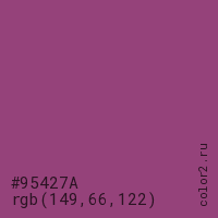 Цвет #95427A в цветовой модели RGB обозначается тремя октетами (149, 66, 122) в десятичном формате и #95427A в шестнадцатиричном (hex) формате, которые являются интенсивностью красного 149 (hex 95), интенсивность зелёного 66 (hex 42) и интенсивность синего 122 (hex 7A).