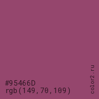 Цвет #95466D в цветовой модели RGB обозначается тремя октетами (149, 70, 109) в десятичном формате и #95466D в шестнадцатиричном (hex) формате, которые являются интенсивностью красного 149 (hex 95), интенсивность зелёного 70 (hex 46) и интенсивность синего 109 (hex 6D).