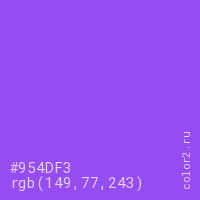 Цвет #954DF3 в цветовой модели RGB обозначается тремя октетами (149, 77, 243) в десятичном формате и #954DF3 в шестнадцатиричном (hex) формате, которые являются интенсивностью красного 149 (hex 95), интенсивность зелёного 77 (hex 4D) и интенсивность синего 243 (hex F3).