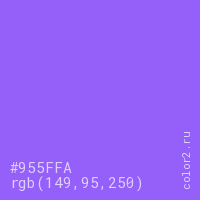 Цвет #955FFA в цветовой модели RGB обозначается тремя октетами (149, 95, 250) в десятичном формате и #955FFA в шестнадцатиричном (hex) формате, которые являются интенсивностью красного 149 (hex 95), интенсивность зелёного 95 (hex 5F) и интенсивность синего 250 (hex FA).