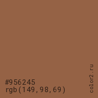 Цвет #956245 в цветовой модели RGB обозначается тремя октетами (149, 98, 69) в десятичном формате и #956245 в шестнадцатиричном (hex) формате, которые являются интенсивностью красного 149 (hex 95), интенсивность зелёного 98 (hex 62) и интенсивность синего 69 (hex 45).
