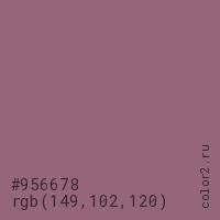 Цвет #956678 в цветовой модели RGB обозначается тремя октетами (149, 102, 120) в десятичном формате и #956678 в шестнадцатиричном (hex) формате, которые являются интенсивностью красного 149 (hex 95), интенсивность зелёного 102 (hex 66) и интенсивность синего 120 (hex 78).