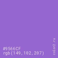 Цвет #9566CF в цветовой модели RGB обозначается тремя октетами (149, 102, 207) в десятичном формате и #9566CF в шестнадцатиричном (hex) формате, которые являются интенсивностью красного 149 (hex 95), интенсивность зелёного 102 (hex 66) и интенсивность синего 207 (hex CF).