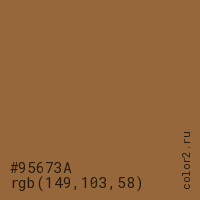 Цвет #95673A в цветовой модели RGB обозначается тремя октетами (149, 103, 58) в десятичном формате и #95673A в шестнадцатиричном (hex) формате, которые являются интенсивностью красного 149 (hex 95), интенсивность зелёного 103 (hex 67) и интенсивность синего 58 (hex 3A).