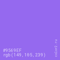 Цвет #9569EF в цветовой модели RGB обозначается тремя октетами (149, 105, 239) в десятичном формате и #9569EF в шестнадцатиричном (hex) формате, которые являются интенсивностью красного 149 (hex 95), интенсивность зелёного 105 (hex 69) и интенсивность синего 239 (hex EF).