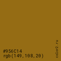 Цвет #956C14 в цветовой модели RGB обозначается тремя октетами (149, 108, 20) в десятичном формате и #956C14 в шестнадцатиричном (hex) формате, которые являются интенсивностью красного 149 (hex 95), интенсивность зелёного 108 (hex 6C) и интенсивность синего 20 (hex 14).
