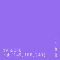 Цвет #956CF0 в цветовой модели RGB обозначается тремя октетами (149, 108, 240) в десятичном формате и #956CF0 в шестнадцатиричном (hex) формате, которые являются интенсивностью красного 149 (hex 95), интенсивность зелёного 108 (hex 6C) и интенсивность синего 240 (hex F0).