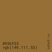 Цвет #956F35 в цветовой модели RGB обозначается тремя октетами (149, 111, 53) в десятичном формате и #956F35 в шестнадцатиричном (hex) формате, которые являются интенсивностью красного 149 (hex 95), интенсивность зелёного 111 (hex 6F) и интенсивность синего 53 (hex 35).