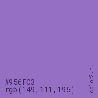 Цвет #956FC3 в цветовой модели RGB обозначается тремя октетами (149, 111, 195) в десятичном формате и #956FC3 в шестнадцатиричном (hex) формате, которые являются интенсивностью красного 149 (hex 95), интенсивность зелёного 111 (hex 6F) и интенсивность синего 195 (hex C3).