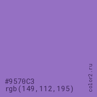 Цвет #9570C3 в цветовой модели RGB обозначается тремя октетами (149, 112, 195) в десятичном формате и #9570C3 в шестнадцатиричном (hex) формате, которые являются интенсивностью красного 149 (hex 95), интенсивность зелёного 112 (hex 70) и интенсивность синего 195 (hex C3).