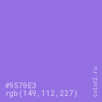 Цвет #9570E3 в цветовой модели RGB обозначается тремя октетами (149, 112, 227) в десятичном формате и #9570E3 в шестнадцатиричном (hex) формате, которые являются интенсивностью красного 149 (hex 95), интенсивность зелёного 112 (hex 70) и интенсивность синего 227 (hex E3).