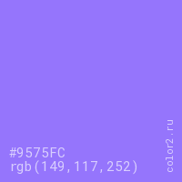 Цвет #9575FC в цветовой модели RGB обозначается тремя октетами (149, 117, 252) в десятичном формате и #9575FC в шестнадцатиричном (hex) формате, которые являются интенсивностью красного 149 (hex 95), интенсивность зелёного 117 (hex 75) и интенсивность синего 252 (hex FC).