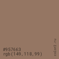 Цвет #957663 в цветовой модели RGB обозначается тремя октетами (149, 118, 99) в десятичном формате и #957663 в шестнадцатиричном (hex) формате, которые являются интенсивностью красного 149 (hex 95), интенсивность зелёного 118 (hex 76) и интенсивность синего 99 (hex 63).
