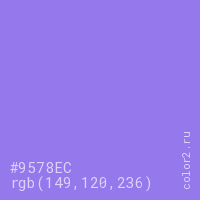 Цвет #9578EC в цветовой модели RGB обозначается тремя октетами (149, 120, 236) в десятичном формате и #9578EC в шестнадцатиричном (hex) формате, которые являются интенсивностью красного 149 (hex 95), интенсивность зелёного 120 (hex 78) и интенсивность синего 236 (hex EC).