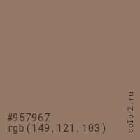 Цвет #957967 в цветовой модели RGB обозначается тремя октетами (149, 121, 103) в десятичном формате и #957967 в шестнадцатиричном (hex) формате, которые являются интенсивностью красного 149 (hex 95), интенсивность зелёного 121 (hex 79) и интенсивность синего 103 (hex 67).
