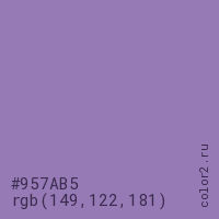 Цвет #957AB5 в цветовой модели RGB обозначается тремя октетами (149, 122, 181) в десятичном формате и #957AB5 в шестнадцатиричном (hex) формате, которые являются интенсивностью красного 149 (hex 95), интенсивность зелёного 122 (hex 7A) и интенсивность синего 181 (hex B5).