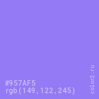 Цвет #957AF5 в цветовой модели RGB обозначается тремя октетами (149, 122, 245) в десятичном формате и #957AF5 в шестнадцатиричном (hex) формате, которые являются интенсивностью красного 149 (hex 95), интенсивность зелёного 122 (hex 7A) и интенсивность синего 245 (hex F5).