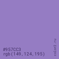 Цвет #957CC3 в цветовой модели RGB обозначается тремя октетами (149, 124, 195) в десятичном формате и #957CC3 в шестнадцатиричном (hex) формате, которые являются интенсивностью красного 149 (hex 95), интенсивность зелёного 124 (hex 7C) и интенсивность синего 195 (hex C3).