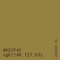 Цвет #957F41 в цветовой модели RGB обозначается тремя октетами (149, 127, 65) в десятичном формате и #957F41 в шестнадцатиричном (hex) формате, которые являются интенсивностью красного 149 (hex 95), интенсивность зелёного 127 (hex 7F) и интенсивность синего 65 (hex 41).