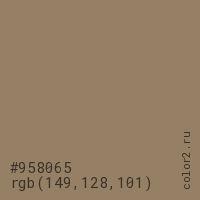 Цвет #958065 в цветовой модели RGB обозначается тремя октетами (149, 128, 101) в десятичном формате и #958065 в шестнадцатиричном (hex) формате, которые являются интенсивностью красного 149 (hex 95), интенсивность зелёного 128 (hex 80) и интенсивность синего 101 (hex 65).