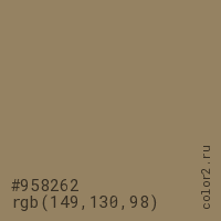 Цвет #958262 в цветовой модели RGB обозначается тремя октетами (149, 130, 98) в десятичном формате и #958262 в шестнадцатиричном (hex) формате, которые являются интенсивностью красного 149 (hex 95), интенсивность зелёного 130 (hex 82) и интенсивность синего 98 (hex 62).