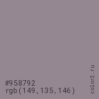 Цвет #958792 в цветовой модели RGB обозначается тремя октетами (149, 135, 146) в десятичном формате и #958792 в шестнадцатиричном (hex) формате, которые являются интенсивностью красного 149 (hex 95), интенсивность зелёного 135 (hex 87) и интенсивность синего 146 (hex 92).