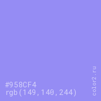 Цвет #958CF4 в цветовой модели RGB обозначается тремя октетами (149, 140, 244) в десятичном формате и #958CF4 в шестнадцатиричном (hex) формате, которые являются интенсивностью красного 149 (hex 95), интенсивность зелёного 140 (hex 8C) и интенсивность синего 244 (hex F4).
