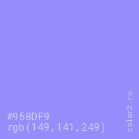 Цвет #958DF9 в цветовой модели RGB обозначается тремя октетами (149, 141, 249) в десятичном формате и #958DF9 в шестнадцатиричном (hex) формате, которые являются интенсивностью красного 149 (hex 95), интенсивность зелёного 141 (hex 8D) и интенсивность синего 249 (hex F9).