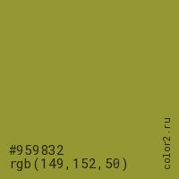 Цвет #959832 в цветовой модели RGB обозначается тремя октетами (149, 152, 50) в десятичном формате и #959832 в шестнадцатиричном (hex) формате, которые являются интенсивностью красного 149 (hex 95), интенсивность зелёного 152 (hex 98) и интенсивность синего 50 (hex 32).