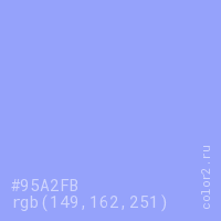Цвет #95A2FB в цветовой модели RGB обозначается тремя октетами (149, 162, 251) в десятичном формате и #95A2FB в шестнадцатиричном (hex) формате, которые являются интенсивностью красного 149 (hex 95), интенсивность зелёного 162 (hex A2) и интенсивность синего 251 (hex FB).