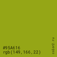 Цвет #95A616 в цветовой модели RGB обозначается тремя октетами (149, 166, 22) в десятичном формате и #95A616 в шестнадцатиричном (hex) формате, которые являются интенсивностью красного 149 (hex 95), интенсивность зелёного 166 (hex A6) и интенсивность синего 22 (hex 16).