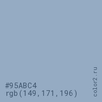 Цвет #95ABC4 в цветовой модели RGB обозначается тремя октетами (149, 171, 196) в десятичном формате и #95ABC4 в шестнадцатиричном (hex) формате, которые являются интенсивностью красного 149 (hex 95), интенсивность зелёного 171 (hex AB) и интенсивность синего 196 (hex C4).
