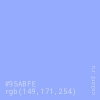 Цвет #95ABFE в цветовой модели RGB обозначается тремя октетами (149, 171, 254) в десятичном формате и #95ABFE в шестнадцатиричном (hex) формате, которые являются интенсивностью красного 149 (hex 95), интенсивность зелёного 171 (hex AB) и интенсивность синего 254 (hex FE).