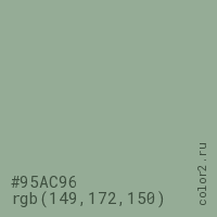 Цвет #95AC96 в цветовой модели RGB обозначается тремя октетами (149, 172, 150) в десятичном формате и #95AC96 в шестнадцатиричном (hex) формате, которые являются интенсивностью красного 149 (hex 95), интенсивность зелёного 172 (hex AC) и интенсивность синего 150 (hex 96).