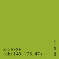 Цвет #95AF2F в цветовой модели RGB обозначается тремя октетами (149, 175, 47) в десятичном формате и #95AF2F в шестнадцатиричном (hex) формате, которые являются интенсивностью красного 149 (hex 95), интенсивность зелёного 175 (hex AF) и интенсивность синего 47 (hex 2F).