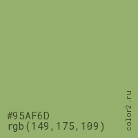 Цвет #95AF6D в цветовой модели RGB обозначается тремя октетами (149, 175, 109) в десятичном формате и #95AF6D в шестнадцатиричном (hex) формате, которые являются интенсивностью красного 149 (hex 95), интенсивность зелёного 175 (hex AF) и интенсивность синего 109 (hex 6D).