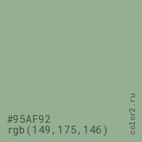 Цвет #95AF92 в цветовой модели RGB обозначается тремя октетами (149, 175, 146) в десятичном формате и #95AF92 в шестнадцатиричном (hex) формате, которые являются интенсивностью красного 149 (hex 95), интенсивность зелёного 175 (hex AF) и интенсивность синего 146 (hex 92).
