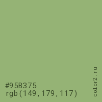 Цвет #95B375 в цветовой модели RGB обозначается тремя октетами (149, 179, 117) в десятичном формате и #95B375 в шестнадцатиричном (hex) формате, которые являются интенсивностью красного 149 (hex 95), интенсивность зелёного 179 (hex B3) и интенсивность синего 117 (hex 75).