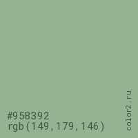 Цвет #95B392 в цветовой модели RGB обозначается тремя октетами (149, 179, 146) в десятичном формате и #95B392 в шестнадцатиричном (hex) формате, которые являются интенсивностью красного 149 (hex 95), интенсивность зелёного 179 (hex B3) и интенсивность синего 146 (hex 92).