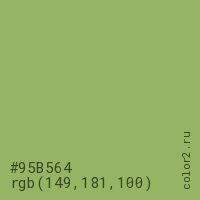 Цвет #95B564 в цветовой модели RGB обозначается тремя октетами (149, 181, 100) в десятичном формате и #95B564 в шестнадцатиричном (hex) формате, которые являются интенсивностью красного 149 (hex 95), интенсивность зелёного 181 (hex B5) и интенсивность синего 100 (hex 64).