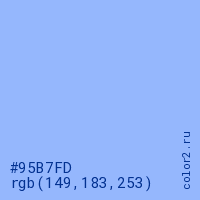 Цвет RGB(149, 183, 253) в процентом отношении количества цвета состоит из 58.4% красного (red), 71.8% зелёного (green) и 99.2% синего (blue).