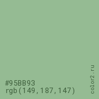 Цвет #95BB93 в цветовой модели RGB обозначается тремя октетами (149, 187, 147) в десятичном формате и #95BB93 в шестнадцатиричном (hex) формате, которые являются интенсивностью красного 149 (hex 95), интенсивность зелёного 187 (hex BB) и интенсивность синего 147 (hex 93).