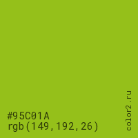 Цвет #95C01A в цветовой модели RGB обозначается тремя октетами (149, 192, 26) в десятичном формате и #95C01A в шестнадцатиричном (hex) формате, которые являются интенсивностью красного 149 (hex 95), интенсивность зелёного 192 (hex C0) и интенсивность синего 26 (hex 1A).