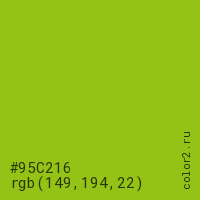 Цвет #95C216 в цветовой модели RGB обозначается тремя октетами (149, 194, 22) в десятичном формате и #95C216 в шестнадцатиричном (hex) формате, которые являются интенсивностью красного 149 (hex 95), интенсивность зелёного 194 (hex C2) и интенсивность синего 22 (hex 16).
