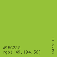Цвет #95C238 в цветовой модели RGB обозначается тремя октетами (149, 194, 56) в десятичном формате и #95C238 в шестнадцатиричном (hex) формате, которые являются интенсивностью красного 149 (hex 95), интенсивность зелёного 194 (hex C2) и интенсивность синего 56 (hex 38).