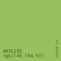 Цвет #95C25D в цветовой модели RGB обозначается тремя октетами (149, 194, 93) в десятичном формате и #95C25D в шестнадцатиричном (hex) формате, которые являются интенсивностью красного 149 (hex 95), интенсивность зелёного 194 (hex C2) и интенсивность синего 93 (hex 5D).