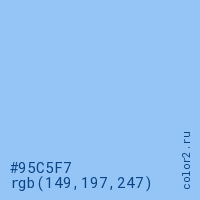 Цвет #95C5F7 в цветовой модели RGB обозначается тремя октетами (149, 197, 247) в десятичном формате и #95C5F7 в шестнадцатиричном (hex) формате, которые являются интенсивностью красного 149 (hex 95), интенсивность зелёного 197 (hex C5) и интенсивность синего 247 (hex F7).