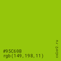 Цвет #95C60B в цветовой модели RGB обозначается тремя октетами (149, 198, 11) в десятичном формате и #95C60B в шестнадцатиричном (hex) формате, которые являются интенсивностью красного 149 (hex 95), интенсивность зелёного 198 (hex C6) и интенсивность синего 11 (hex 0B).