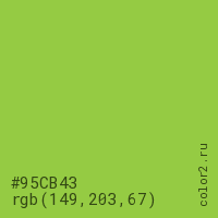 Цвет #95CB43 в цветовой модели RGB обозначается тремя октетами (149, 203, 67) в десятичном формате и #95CB43 в шестнадцатиричном (hex) формате, которые являются интенсивностью красного 149 (hex 95), интенсивность зелёного 203 (hex CB) и интенсивность синего 67 (hex 43).